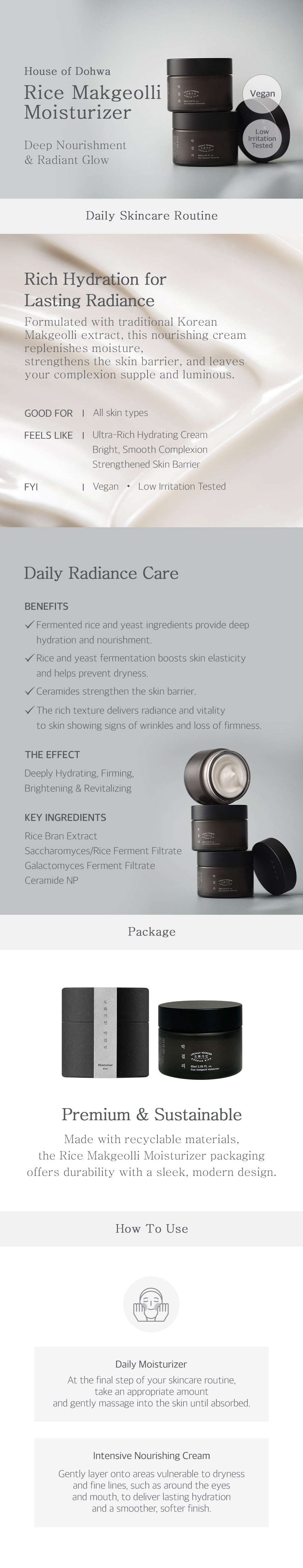 A moisturizer made using a deeply moisturizing formulation that complements the well-prepared skin from the Makgeolli Toner and Serum by infusing a deeper level of nourishment.
