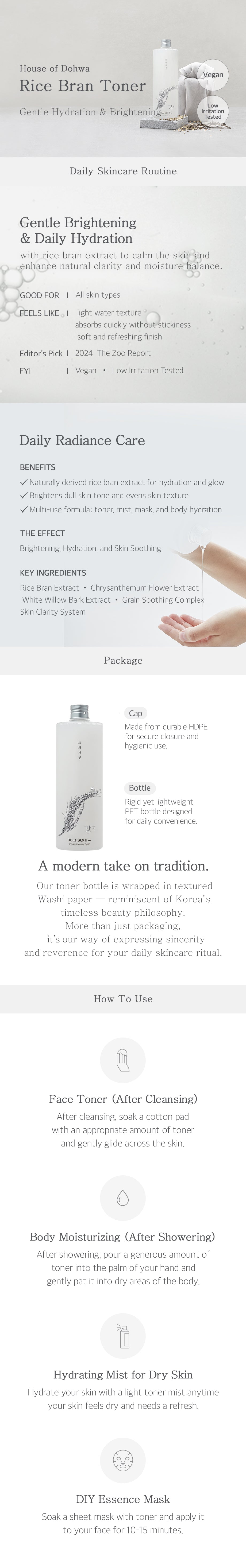 - Editor Sarah Y. Wu raved about the Rice Bran Toner in the Zoe Report saying, that it is made "to strengthen your moisture barrier, soothe, smooth, and instantly drench your skin with hydration, it's the best way to begin your daily anti-inflammaging routine."