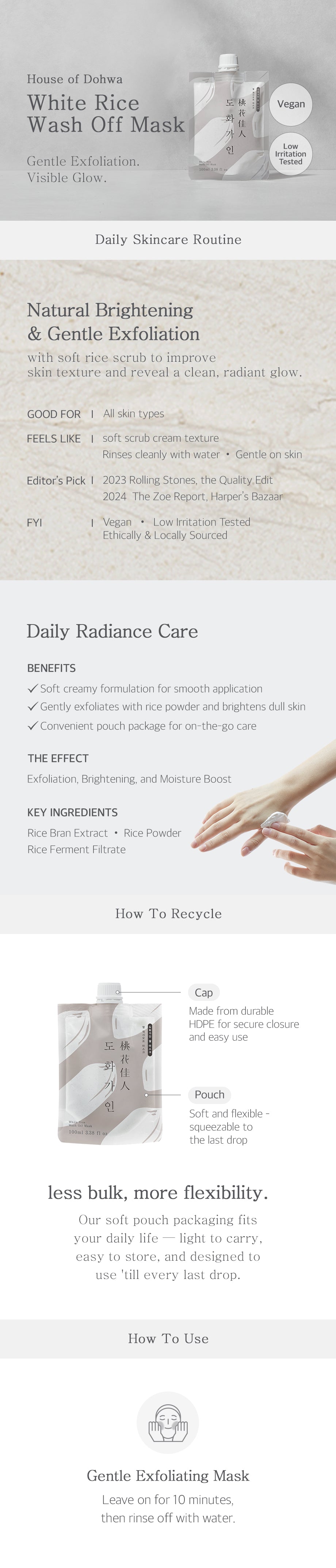 - This wash off mask has a soft, creamy texture formula with real rice grains that give a soft scrubbing effect that gently cares for dead skin cells.